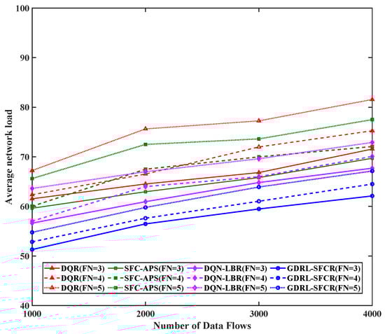 Network average load of different data flows. The red curve is the result based on the reinforcement learning algorithm (DQR), the green curve is the result of the traditional graph theory algorithm (SFC-APS), the magenta curve is the result of the algorithm proposed in this paper (DQN-LBR), and the blue curve is the result of the algorithm proposed in this paper (GDRL-SFCR). FN represents the total number of functional nodes in the end-to-end path SFC constraint.