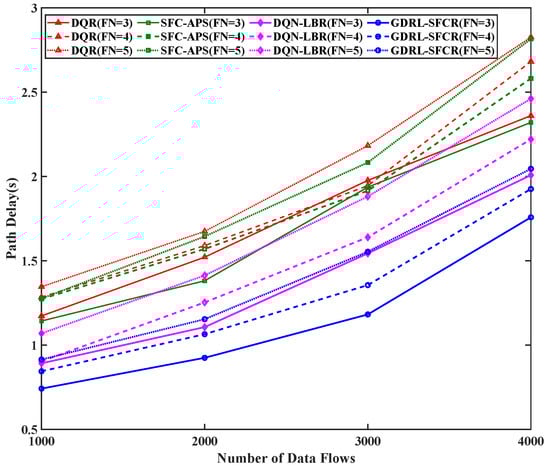 Average path delay of different data flows. The red curve is the result based on the reinforcement learning algorithm (DQR), the green curve is the result of the traditional graph theory algorithm (SFC-APS), the magenta curve is the result of the algorithm proposed in this paper (DQN-LBR), and the blue curve is the result of the algorithm proposed in this paper (GDRL-SFCR). FN represents the total number of functional nodes in the end-to-end path SFC constraint.