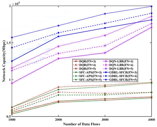 Network capacity of different data flows. The red curve is the result based on the reinforcement learning algorithm (DQR), the green curve is the result of the traditional graph theory algorithm (SFC-APS), the magenta curve is the result of the algorithm proposed in this paper (DQN-LBR), and the blue curve is the result of the algorithm proposed in this paper (GDRL-SFCR). FN represents the total number of functional nodes in the end-to-end path SFC constraint.