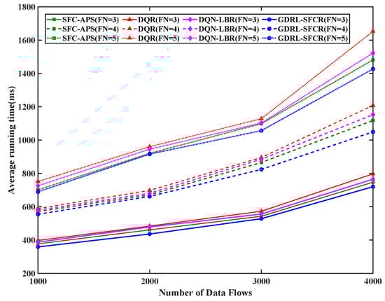 Average running time of different data flows for all algorithms. The red curve is the result based on the reinforcement learning algorithm (DQR), the green curve is the result of the traditional graph theory algorithm (SFC-APS), the magenta curve is the result of the algorithm proposed in this paper (DQN-LBR), and the blue curve is the result of the algorithm proposed in this paper (GDRL-SFCR). FN represents the total number of functional nodes in the end-to-end path SFC constraint.