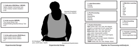 To evaluate the feasibility of using an open-source dataset for transfer learning and real-world data, we used custom Python (version 3.8) data processing and feature extraction scripts on both the WESAD dataset and real-world data (see Figure 1). Custom Python scripts are available in the following code repository: https://github.com/AbdulAlkurdi/anxietyFB (accessed on 3 February 2025). The WESAD dataset [8] was used as a basis for anxiety detection with physiological signals and the introduction of synthetic noise. The study involved 15 participants, with a gender distribution of 20% female, and the use of two wearable devices. The RespiBAN Professional (PLUX Wireless Biosignal S.A., Lisbon, Portugal) was used to record ECG, EDA, EMG, RESP, skin temperature (TEMP), and 3-axis acceleration (ACC) at 700 Hz, but was downsampled to 70 Hz for all modalities. The E4 Wristband (Empatica, Inc., Boston, MA, USA) was used to record BVP, EDA, TEMP, and ACC data at varying sampling rates. The study’s protocol included baseline (53%), amusement (17%), and stress (30%) conditions. Participant self-reports after each condition provided the ground truth, incorporating scales like Positive and Negative Affect Schedule (PANAS) [28], State-Trait Anxiety Inventory (STAI) [29], and Short Stress State Questionnaire (SSSQ) [30], as previously described.