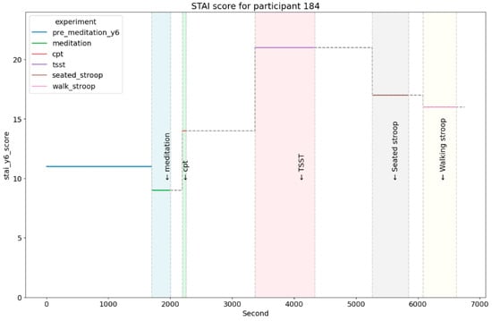 STAI score for one of the participants at the different test conditions experienced. The threshold considered to be indicative of the observation of anxiety is 11 for the STAI Y6. It can be observed that the meditation session reduced the anxiety level, while the cold pressor test (CPT) increased it. For this participant, the Trier Social Stress Test (TSST) seemed to be the highest cause of anxiety.