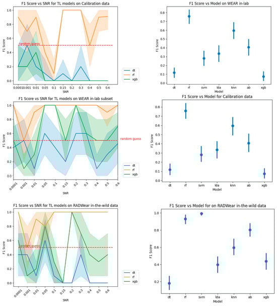 Afterwards, models that were trained using a subset of the WESAD dataset with and without noise augmentation that matched in modalities and were similar in locations were tested on the three subsets to test the validity of transfer learning for this application. Feature-based models were employed. DT, RF, LDA, KNN, AB, SVM, and XGB were utilized to test performance for transfer learning, using re-used models without additional fine-tuning. As seen in Figure 3, ML noise-augmented data were used to train feature-based models that were directly applied to the three subsets of RADWear and WEAR data.