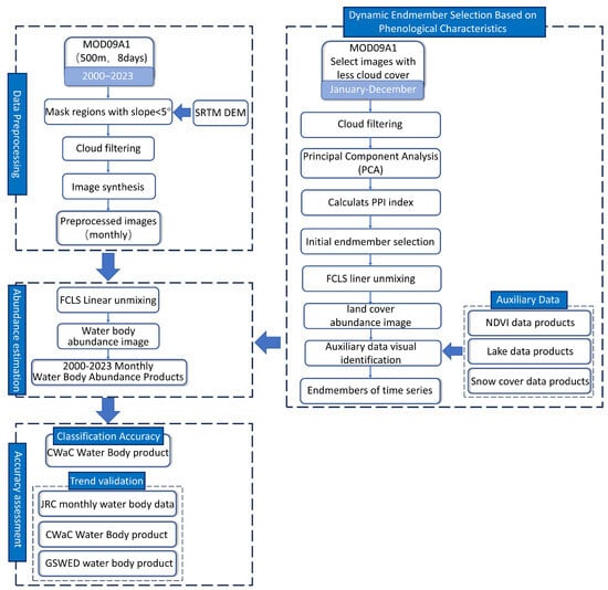 The process of generating the Tibetan Plateau water body abundance map consists of four steps (Figure 2), including preprocessing of surface reflectance data, dynamic endmember selection based on phenological characteristics, abundance inversion, and accuracy assessment.