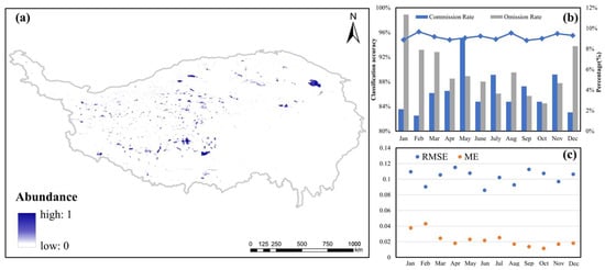 Abundance maps and validation results: (a) Abundance results for July 2017; (b) Distribution of classification accuracy, commission rate, and omission rate; (c) Scatter plot of RMSE and ME distribution.