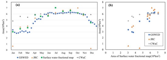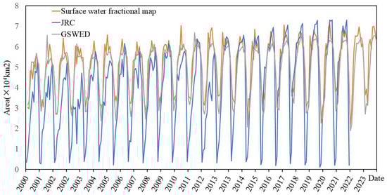 Figure 5 illustrates the comparison of water body area between the 2017 Surface Water Fractional Map and other water body products (GSWED, JRC, and CWaC). As shown in the figure, the Surface Water Fractional Map exhibits a similar trend in water body area changes compared to the other products. During the dry season from January to March, the water body area in the Surface Water Fractional Map remains relatively stable at approximately 3 × 104 km2. This value is closely aligned with that of GSWED but significantly higher than the water body areas reported by JRC and CWaC. Starting in April, as precipitation increases, the water body area in the Surface Water Fractional Map shows a marked increase, peaking during the wet season from May to September, fluctuating between 60,000 km2 and 70,000 km2. During this period, the changes in water body area for the Surface Water Fractional Map are comparable to those of GSWED and CWaC, although they are slightly higher than those reported by JRC. The differences between the products during the wet season are minimal, indicating a high degree of consistency. This suggests that the products are effective in capturing large-scale water body changes during periods of high water levels. As October approaches, a decline in water body area is observed across all products. The water body area in the Surface Water Fractional Map gradually decreases, reaching its lowest point of the year in December. In comparison with other water body products, the declining trend of the Surface Water Fractional Map aligns closely with that of GSWED and CWaC, while remaining slightly higher than that of JRC. This discrepancy may be attributed to differences in algorithms and data sources among the various products.