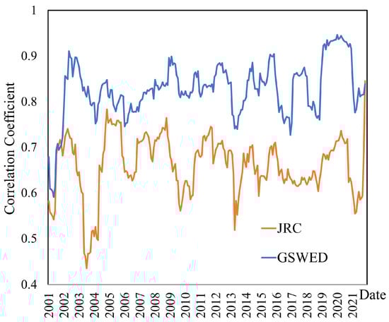 We conducted a sliding window correlation analysis (with a window size of 12 months) to compare the correlation trends between the water body abundance map produced in this study and the JRC and GSWED datasets. As illustrated in Figure 7, the correlation coefficient between the water body abundance map and the GSWED dataset is generally high with minimal fluctuations, consistently remaining above 0.7. This indicates a strong consistency and high correlation between the two datasets. In contrast, the correlation coefficient with the JRC dataset is significantly lower and exhibits greater fluctuations, predominantly ranging between 0.3 and 0.7. This disparity in correlation can be attributed to the data sources utilized for the water body products. Both the abundance product and the GSWED water body product employ MODIS surface reflectance data as their source, which accounts for the higher correlation. Conversely, the JRC water body product relies on Landsat imagery, which has a lower temporal frequency and is unable to effectively capture dynamic water body changes, leading to a lower correlation with the water body abundance map produced in this study. The analysis indicates that the water body abundance map generated in this study exhibits a certain degree of correlation with both the GSWED and JRC datasets. These findings provide important insights into the applicability of different datasets for water body abundance monitoring applications.