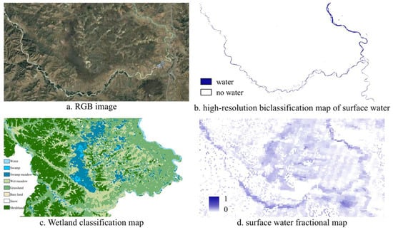 The primary advantage of the water body abundance map lies in its ability to reveal subtle variations in moisture content within a region, which is particularly important for wetland monitoring. Wetland areas often lack distinct boundaries, yet they typically exhibit high soil moisture content. The water body abundance map effectively captures and expresses these characteristics. As shown in Figure 10 below, the area in question is a floodplain wetland that cannot be adequately monitored using high-resolution binary classification water body maps. However, the water body abundance map successfully characterizes the distribution of water bodies in floodplains, marshes, and other wetland types. By analyzing the abundance values, we can further detail the abundance ranges of different wetland types, such as floodplains and marshes. This, in turn, allows for a deeper understanding of the spatial distribution of water content within wetlands, providing a scientific basis for wetland conservation and management.