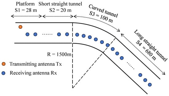 The tunnel measurement was conducted between Shanghai University Station and Qihua Road Station on Shanghai Metro Line 7. The tunnel has a radius of 2.775 m, and its overall tunnel structure consists of four segments: platform, short straight tunnel, curved tunnel, and long straight tunnel, as illustrated in Figure 1. Considering the limited opportunities for conducting actual measurements in mmWave tunnels, it is essential to calibrate simulation parameters using data from measured scenarios. This calibration ensures the accuracy and reliability of subsequent simulation experiments, enabling the exploration of channel characteristics across a broader range of scenarios.