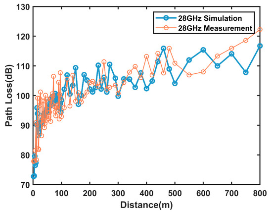 After adjusting the simulation parameters several times, the Mean Absolute Error (MAE), which is denoted as Equation (1), was calculated as 4.5 dB. The comparison results between measurement and simulation are shown in Figure 2, which shows that the error between measurement and simulation is small and that the fitted parameters are more credible.