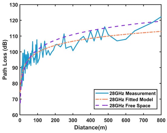 In summary, these three models have distinct characteristics and applicability. Figure 3 shows the measured path loss, the path loss in free space, and the path loss of the floating intercept model using Equation (4) in the subway tunnel scenario when the center frequency is 28 GHz.