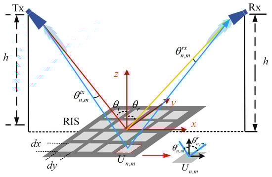 where and represent the elevation angle from the RIS unit to the Tx and the elevation angle from the Rx, respectively, and represent the elevation angle from the Tx and the Rx to the RIS unit. The coefficient is used to fit the actual radiation pattern of the electromagnetic element and is related to the specific design of the electromagnetic element.
