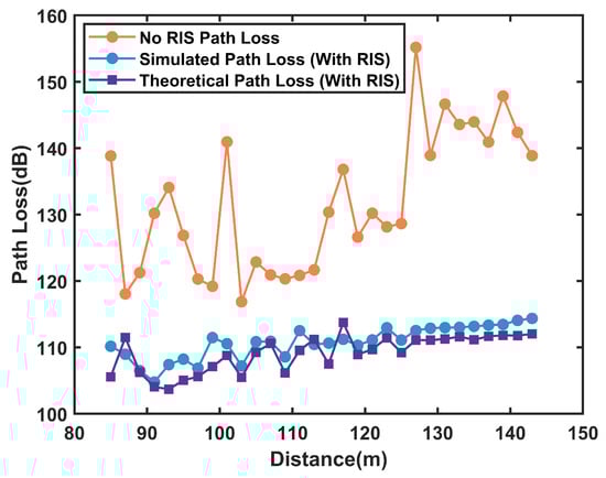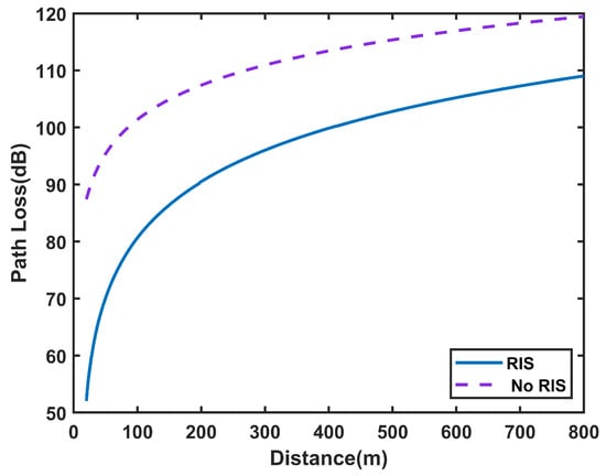 Based on the above studies, considering the RIS-assisted wireless communication system shown in Figure 4, we focus on the path loss characteristics of RIS in free space. Numerical simulations were conducted using Equation (5) to investigate the path loss variation with the distance between Tx and Rx. The simulation parameters are shown in Table 3. The distance between Tx and Rx was set to range from 20 m to 800 m to explore the trend of path loss when RIS is deployed. The simulation results are presented in Figure 5.