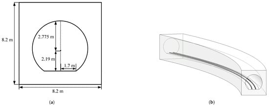 To study the performance of RIS-assisted wireless communication for Rx in tunnel scenarios and validate the RIS path loss model proposed in Section 3, we rebuilt a simulation platform using the calibrated model parameters from Section 2. The study focuses on a curved tunnel with a curvature radius of 400 m. The arched cross-section tunnel has a radius of 2.775 m, while the rectangular section has a width of 8.2 m, and the arched bottom section has a width of 3.4 m. The tunnel is made of concrete, with metal tracks at the center. The tunnel cross-section and 3D model are depicted in Figure 6. The tunnel material parameters in the simulation are set according to Table 2.
