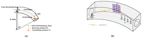 The placement of Tx, Rx, and RIS in the tunnel scenario is illustrated in Figure 7. The Tx is placed on one side of the tunnel wall, while the Rx moves along the central interface of the tunnel, away from the Tx. When a tangent line is drawn from Tx to the tunnel sidewall, the curved tunnel is divided into the LOS region (upper region of the pink line) and the NLOS region (lower region of the pink line). The intersection point of the tangent line and the centerline of the tunnel marks the boundary between the LOS and NLOS regions (represented by the orange dot). The red dot represents the Tx, the yellow dots denote the Rx, the orange dot highlights the LOS-NLOS boundary, and the RIS deployed on the tunnel wall is shown in purple.