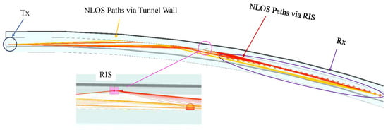 Figure 9 illustrates the simulated signal propagation paths within the tunnel. The paths from the Tx to the Rx are primarily composed of NLOS paths via the tunnel wall (orange lines) and NLOS paths reflected by the RIS (red lines). Furthermore, to facilitate observation of the signal propagation, the upper part of the simulated tunnel is set to be available but invisible.