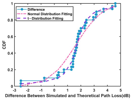 In order to validate the theoretical model of RIS-based path loss in tunnel scenarios proposed in Section 3 of this article, the differences between the simulated path loss results and the theoretically calculated values were obtained by subtraction. These differences were analyzed using the cumulative distribution function (CDF). It is found that the difference between the simulation results and the theoretical results is step-like and contains negative values. According to the statistical characteristics of the data, we consider using t-distribution and normal distribution fitting. The t-distribution, or more precisely the tLocation-Scale distribution [23,24], can better describe the distribution characteristics of the difference, especially when dealing with fat-tailed characteristics or outliers. The tLocation-Scale distribution can flexibly adjust the shape of the distribution by introducing the location parameter , the scale parameter , and the degree of freedom parameter to more accurately capture the uncertainty in the communication environment. Its probability density function can be expressed as follows.