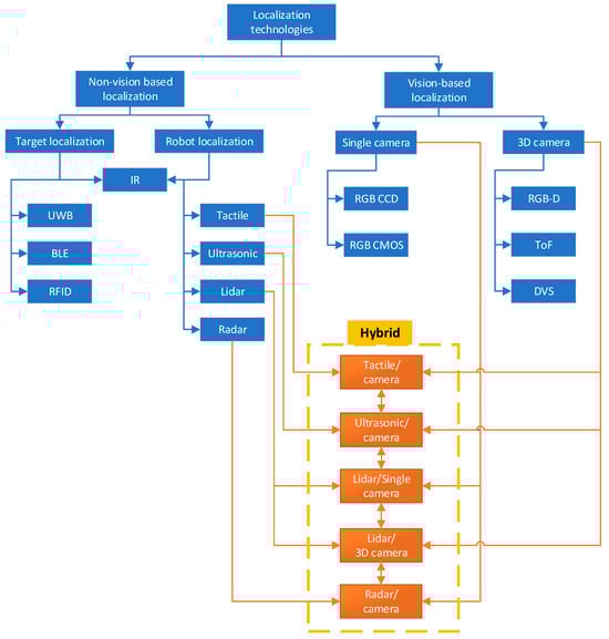 Non-vision-based localization technologies play a crucial role in the field of robotics, especially in environments where visual data may be unreliable or unavailable. These technologies encompass a variety of methods and sensors designed to enhance a robot’s ability to localize and navigate itself within its environment, leveraging alternative sensory data to achieve precise and reliable navigation. The same is true of the common non-vision-based technologies, which are shown on the left side of Figure 2.