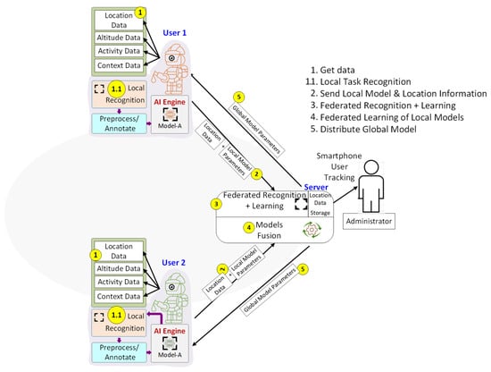 The proposed federated learning-based elderly monitoring system employs smartphones as edge devices as illustrated in Figure 1. The system continuously collects real-time data from built-in smartphone sensors for activity recognition, location tracking, altitude estimation, and contextual awareness. Federated learning ensures that models are trained locally, with periodic updates aggregated at a central server, enhancing performance without sharing raw data.