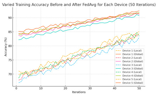 Federated learning has emerged as a powerful technique for training machine learning models in a decentralized manner, allowing data to remain on local devices while model updates are shared with a central server [10]. This approach is particularly useful in cases where data privacy is a concern, as it ensures that raw data are not transmitted to the server [11,12]. However, in the context of elderly care, continuous monitoring often requires certain data, such as location and altitude information, to be transmitted to the server for effective tracking and oversight [13]. Despite this, federated learning still plays a crucial role in enhancing the performance of activity recognition models across multiple devices without the need for centralizing all the raw data [14,15].