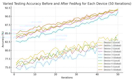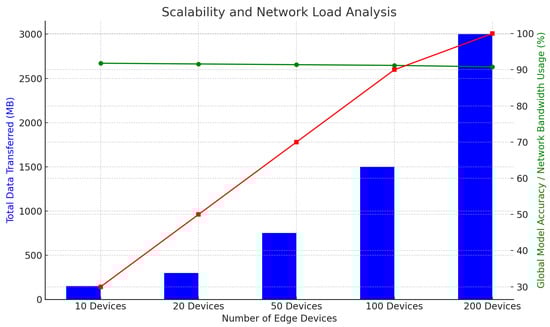 Table 8 evaluates the system’s scalability by analyzing the impact of varying numbers of edge devices on communication overhead and model performance. As the number of devices increases from 10 to 200, the total amount of data transferred grows significantly. However, the global model accuracy remains stable, decreasing slightly from 91.8% to 90.8%. Network bandwidth usage scales linearly, demonstrating the system’s ability to maintain high accuracy under increasing load.