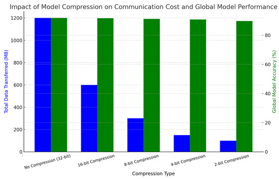 The visualization in Figure 5 illustrates the trade-off between communication cost and global model accuracy in the federated learning system. As compression increases from no compression (32-bit) to 2-bit, the data transferred reduce by over 90%. However, the global model accuracy remains relatively stable, demonstrating that compression optimizes bandwidth usage while preserving high accuracy.