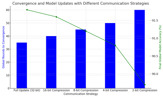 The visualization in Figure 6 illustrates the trade-off between communication strategies and model convergence. The blue bars represent the number of global rounds needed for convergence, while the green line shows the final accuracy for each strategy. As compression increases from 32-bit to 2-bit, convergence slows from 35 to 60 rounds, but accuracy remains stable, emphasizing the balance between communication efficiency and model performance.
