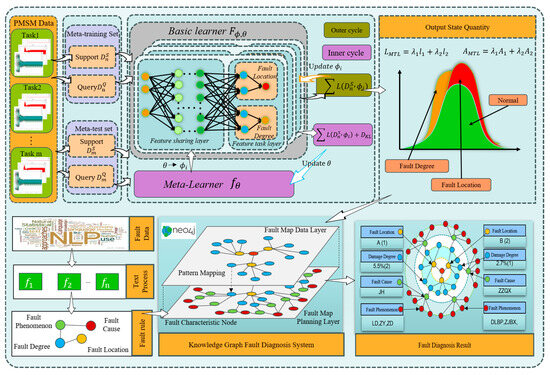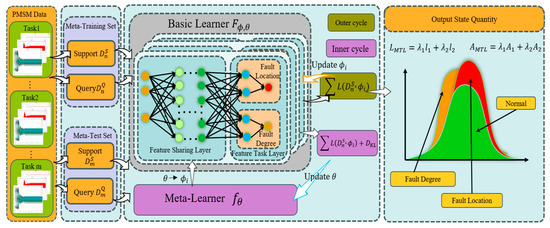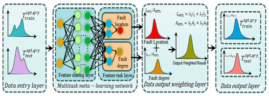 Each task contains a training set (a support set and a query set) and a test set; usually, according to the different forms of training tasks, the support set and query set of each task are set in the form of N-way, K-shot, and N-way, Q-query, respectively. The test dataset is divided into N-way, Q-query. The query set optimizes the model, and the test set fine-tunes the model parameters. In model training, the support set is used to train the model parameters, which is applied to the model of MTL fault location and fault degree as the core data for training, and the preliminary model parameter is obtained. Then, the query set takes on the task of optimizing parameter and fine-tuning it to obtain a better model parameter . In this process, the basic learner is mainly used to dig deeply into the unique characteristics of each task. At the same time, the meta-learner is dedicated to capturing the commonalities between tasks and realizing the effective transfer and integration of knowledge.