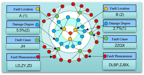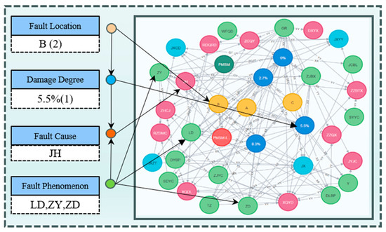 The fault text node is the entity expression under a specific working condition, and the fault data node is the entity expression of the sampling fragment of the PMSM running signal under multiple working conditions. As shown in Figure 7, the text is extracted as the fault rule method, taking the PMSM operation record file under a certain working condition as an example. The characteristic signal labels of “Fault location”, “ Fault degree”, and “Fault phenomenon” are combined with the fault text nodes of “Fault location”, “damage depth”, and “Fault manifestation” in the triplet relationship of <Fault data node, belong to, Fault text node>, and the “fault cause” is derived through the KG rule chain, as shown in Figure 8.