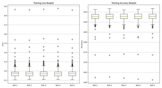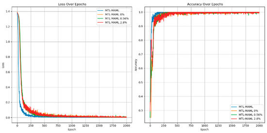 Experiments with different voltage unbalance degrees were carried out under a 5 N*m load. The information in the Figure 22 clearly shows that compared with fault diagnosis under different voltage balance states, as the voltage unbalance degree increases, the loss value under the corresponding state will increase, and the diagnostic accuracy will decrease. The fluctuation range will also become more intense. The loss value correspondingly increases. The accuracy rate is stable at 99.75 ± 0.25%, as shown in Table 10 below.