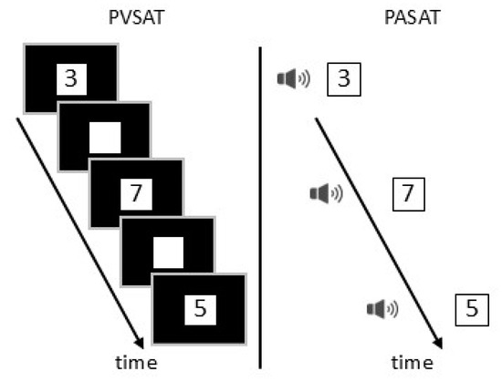 The visual cognitive task (PVSAT) and auditory cognitive task (PASAT) required participants to sum a single-digit number presented every 2 s with the number that preceded it. In the PVSAT, numbers were displayed at the center of the screen, while in the PASAT, numbers were delivered as auditory stimuli through speakers.