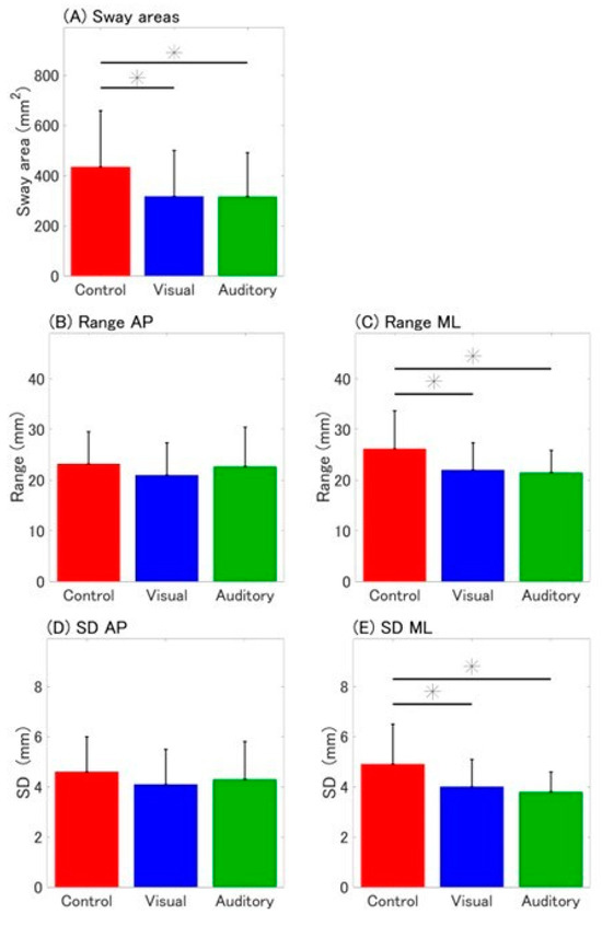Bar plot of postural stability measures under each cognitive condition. Mean and standard deviation (SD) of (A) sway areas, (B,C) range in the anteroposterior (AP) and mediolateral (ML) directions, and (D,E) SD of COP displacement in the AP and ML directions are presented. Error bars indicate standard deviations. * p < 0.05.