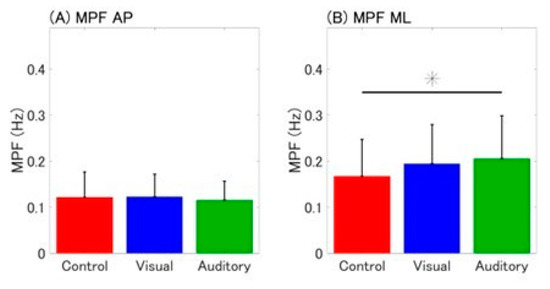 Bar plot of mean power frequency (MPF) for each cognitive condition. Mean and standard deviation (SD) of (A) MPF in the anteroposterior (AP) direction and (B) MPF in the mediolateral (ML) direction are presented. Error bars indicate standard deviations. * p < 0.05.