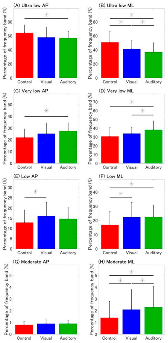 Furthermore, rANOVA revealed a significant main effect of cognitive conditions for power spectrum density across all frequency bands in both directions, except for the moderate frequency band in the AP direction (Table 2). In the AP direction, the ultra-low frequency band significantly decreased under the auditory condition compared to the control condition (p = 0.006; Figure 4A), but no significant differences were observed between the control and visual conditions or between the visual and auditory conditions (control vs. visual: p = 0.070; visual vs. auditory: p = 1.000). Additionally, the power spectrum density of the very low frequency band significantly increased under the auditory condition compared to the control condition (p = 0.009; Figure 4C), but no significant differences were observed between the control and visual conditions or between the visual and auditory conditions (control vs. visual: p = 0.399; visual vs. auditory: p = 0.850). The power spectrum density of the low frequency band was significantly larger under the visual condition compared to the control condition (p = 0.011; Figure 4E), but no significant differences were observed between the control and auditory conditions or between the visual and auditory conditions (control vs. auditory: p = 0.277; visual vs. auditory: p = 0.597). In the ML direction, the ultra-low frequency band was significantly smaller under the auditory condition than the control and visual conditions (control: p < 0.001; visual: p = 0.035; Figure 4B). Additionally, the spectrum density under the visual condition was significantly smaller than under the control condition (p = 0.003). Conversely, the very low frequency band under the auditory condition was significantly larger compared to both the control and visual conditions (control: p = 0.002; visual: p = 0.017; Figure 4D), while no significant differences were observed between the control and visual conditions (p = 0.474). The low frequency band significantly increased under both the visual and auditory conditions compared to the control condition (p = 0.005 and p < 0.001, respectively; Figure 4F), with no significant difference observed between the visual and auditory conditions (p = 1.000). Similarly, for the moderate frequency band, spectrum density significantly increased under the auditory condition compared to both the control and visual conditions (control: p < 0.001; visual: p = 0.041; Figure 4H). Additionally, spectrum density for the moderate frequency band under the visual condition was significantly larger than that under the control condition (p < 0.001).