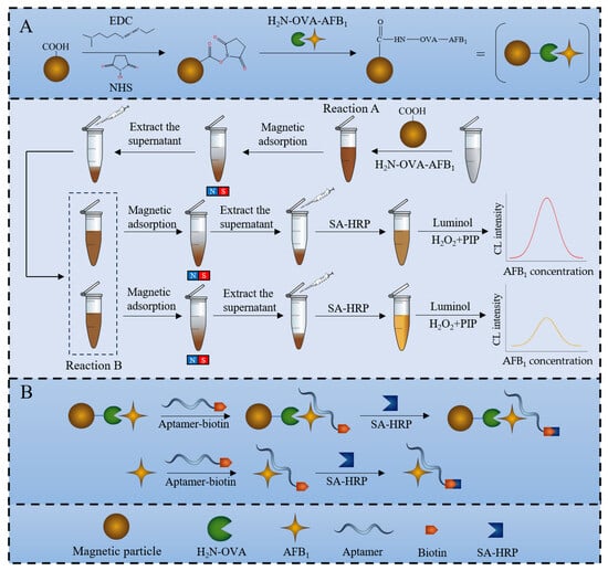 Schematic illustration of AFB1 detection using the chemiluminescence sensor. (A) The process of coating antigen on magnetic particles. (B) Competitive binding aptamer mechanism between AFB1 and AFB1-OVA.