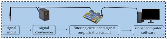 This design uses a self-made fiber optic sensor to detect the chemiluminescence intensity of the AFB1 solution at different concentrations. The sensor system includes an optical signal input module, signal conversion module, filtering circuit, signal amplification circuit, and upper computer software in the computer. The circuit workflow diagram is shown in Figure 2.