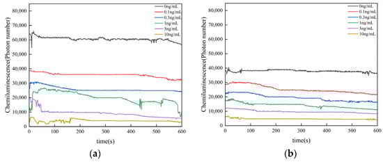 To verify the performance of the sensor under the two different coating conditions of microplate and magnetic particle, we used sensor tests in both situations. The chemiluminescence intensity of the antigen coated on microplate is shown in Figure 6a, and the chemiluminescence intensity of the antigen coated on magnetic particles is shown in Figure 6b. The chemiluminescence intensity under both coating conditions exhibited a notable decrease with an increasing AFB1 concentration within the range of 0.1–10 ng/mL. The dynamic curves obtained under the condition with coated antigen on magnetic particles showed higher consistency than those obtained with coated antigen on microplate. And coating the antigen on magnetic particles resulted in a higher R-squared value; the curve equation for coated antigen on microplate is as follows: