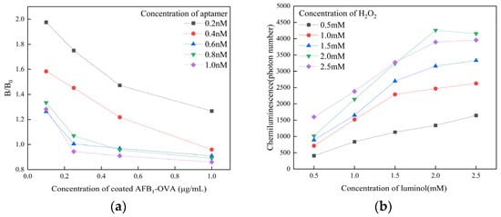 (a) The selection of concentration of AFB1-OVA and aptamer and (b) the selection of concentration of H2O2 and luminol.