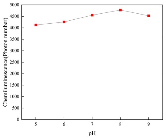 The pH value of the aptamer solution is a key parameter, potentially resulting in the instability of the sensor, so we utilized different pH environments in the step of ligand binding to AFB1, as shown in Figure 5. As the pH value (pH = 5, 6, 7, 8, and 9) of the aptamer solution increased, there was no significant change in the chemiluminescence intensity. This proves the acid and alkali resistance of the aptamer. Due to the relatively highest chemiluminescence intensity at pH value = 7, we ultimately chose to adjust the pH value to 7.0.