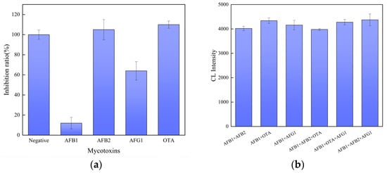 Inhibition ratio (a) and the chemiluminescence intensity of the sensor to AFB1, AFB2, AFB1+ AFB2, AFG1, and AFB1+ AFG1 (b) (n = 3).