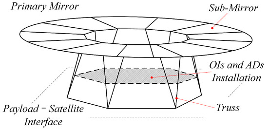 A schematic diagram of a large deployable space optical structure is shown in Figure 1. Its functional components include the primary mirror, secondary mirror, optical instruments, and auxiliary devices (OIs and ADs). To maximize the size of the primary mirror within the constraints of limited launch capacity, the primary mirror is designed as an assembly of multiple sub-mirrors. These sub-mirrors are independently connected to the structural main body.
