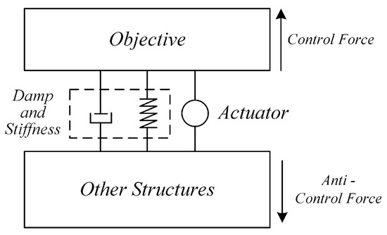 Applying control forces to the target structure (objective) using actuators to reduce vibrations through cancellation is a typical method of active vibration control, as illustrated in Figure 2. Depending on the requirements for control force and stroke, various actuators can be employed, such as piezoelectric materials, magnetostrictive materials, and voice coil motors. According to the principle of action and reaction, these actuators require corresponding support structures (other structures). While exerting control forces on the target structure, they also generate reactive forces (control reaction forces) that act on other parts of the system, potentially causing vibrations in those structures. In most scenarios, these “other structures” are typically vibration sources or high-mass bases, where vibrations induced by control reaction forces are either negligible or inconsequential. However, for micro-vibration control within the payloads of large on-orbit space structures, the microgravity environment and structural flexibility mean that control reaction forces can induce micro-vibrations in other parts of the payload. This can prevent overall system performance from improving as vibrations are controlled and, in some cases, even worsen it—a phenomenon known as the “waterbed effect”. To enable flexible vibration control while minimizing the impact of control reaction forces, an attachable absorber based on inertial actuation principles is employed.