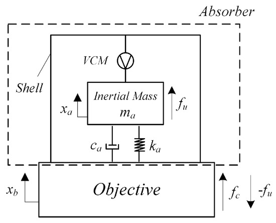 As shown in Figure 3, the attachable absorber is mounted on the objective via its shell. Upon receiving a control voltage input, the voice coil motor (VCM) drives the inertial mass (mover) into motion, applying a control force to the objective. By conducting a force analysis on the objective depicted in the figure, we have: