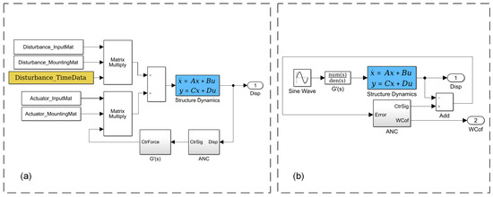 Figure 5a shows the construction of the distributed closed-loop control system, where the input/output matrices are used to determine the locations of the corresponding input/output degrees of freedom within the system’s total degrees of freedom. The installation matrix is used to convert disturbance forces/control forces from local coordinates to global coordinates. Since the ANC method described in Equation (17) requires the secondary path for compensation during the iteration of the weight coefficients, Figure 5b illustrates the system for identifying a single control channel through ANC itself. The output satisfies the following equation: