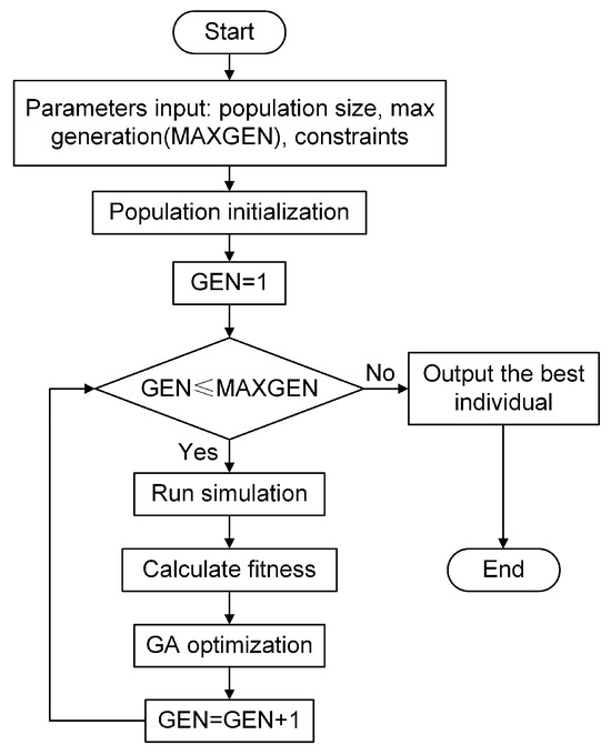 The simulation involves a total of 24 independent control parameters. The two control parameters of each channel not only determine the control performance of that channel but may also theoretically affect the control performance of the other channels. To conveniently determine all the control parameters and achieve better control performance, this study combines optimization algorithms with the simulation system for joint parameter optimization. A genetic algorithm (GA) is used as an example, and its basic process is shown in Figure 6.