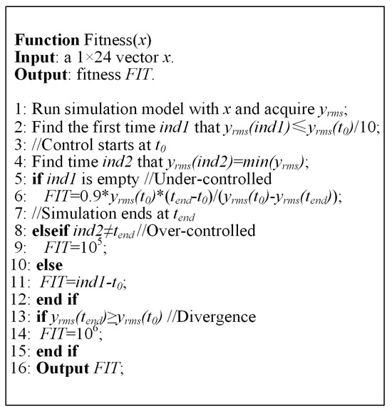 The latter aims to ensure that the control process balances all channels and facilitates uniform and rapid convergence of each channel. In this simulation, the fitness is defined as the time it takes for the index to converge to less than 10% of its value at the start of control. A smaller fitness value indicates better control performance. To improve optimization efficiency, the Simulink simulation time is set to 8 s, with control starting at 3 s. According to the algorithm characteristics, three situations may occur in the simulation: control divergence, over-controlled (control converges and then diverges), and under-controlled (control performance is insufficient at the end of the simulation). For control divergence, the fitness is set to a large value; for over-controlled, it is set to another relatively smaller large value; for under-controlled, the fitness is based on the predicted convergence time through the average convergence rate. The pseudocode for the fitness function based on the RMS index is shown in Figure 7.