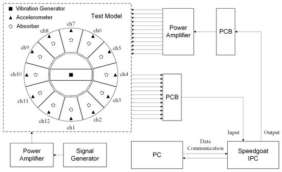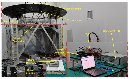 The experimental system mainly consists of the test structure model, data acquisition system, control system, and excitation system. The test structure model is mounted on a satellite payload bay model, with the payload bay fixed to the foundation. The structure model is made of aluminum and includes a main bracket, primary mirror, supporting rods, and secondary mirror. The primary mirror’s individual sub-mirrors are bolted onto the main bracket, with no direct contact between them, forming the subject of the test. The data acquisition system includes accelerometers, data acquisition equipment, and a test computer (PC). All 12 accelerometers are low-frequency piezoelectric accelerometers (Model 1A206E) from DONGHUA, with a sensitivity of 9800 mV/g. They are installed at the surface edges of each secondary mirror. The data acquisition equipment is an industrial PC (IPC) from Speedgoat, which relies on a high-performance FPGA module. This module supports multi-channel analog signal acquisition, processing, and output. After connecting to the test computer, it works with the real-time control module in the Simulink library to directly compile models in Simulink into code, enabling the IPC to collect accelerometer voltage signals, perform data interaction, and generate and output control voltage signals. The control system includes 12 attachable absorbers based on the design in Figure 3, a corresponding power amplifier, as well as the IPC and test computer. The 12 absorbers are installed at the central position of the bottom surface of each sub-mirror. The IPC interfaces with the sensors and amplifiers through a circuit board (PCB). The excitation system mainly consists of one absorber, a signal generator, and a driving power amplifier. The absorber, acting as the exciter, is installed at the center of the main bracket of the test model. It is actively driven by the signal generator in combination with the power amplifier to simulate a constant-frequency excitation within the payload. The system layout schematic is shown in Figure 8 and Figure 9 presents the actual on-site configuration.