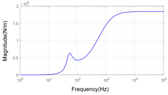 Additionally, a frequency response analysis was also conducted for the relationship between the displacement of the objective and the output force of the absorber based on Equation (7). The amplitude–frequency curve is shown in Figure 11. Essentially, this relationship describes the constraint force exerted by the absorber on the objective when there is no control voltage input to the absorber and the displacement of the objective structure is fixed, while ignoring the various practical constraints.