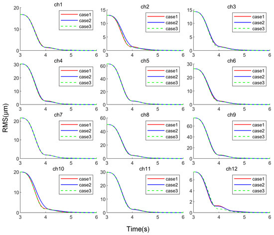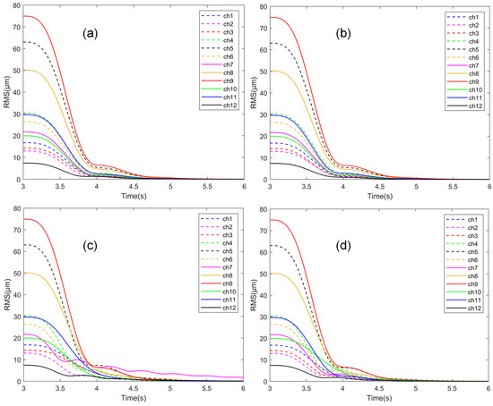 Using the parameters obtained from the four optimization results, closed-loop control simulations were conducted. The RMS value convergence of the 12 channels (ch1~ch12) is shown in Figure 12.