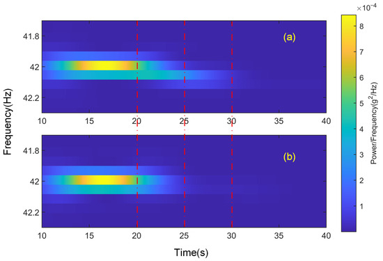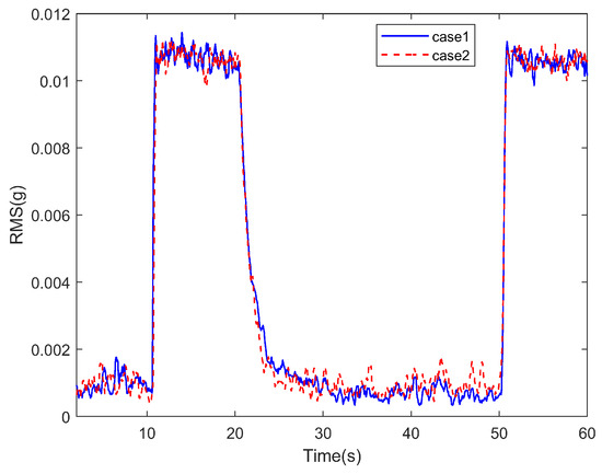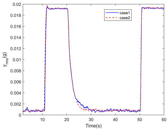 Figure 17 illustrates the time-varying energy distribution of different frequency components in the ch3 signal. From 10 s to 20 s, Figure 17a,b show identical energy distributions, corresponding to the activation of the disturbance during the test. After 20 s, as the control begins, the energy at 42 Hz starts to attenuate. It can be seen that from 20 s to 22 s, the energy at 42 Hz in Figure 17a is slightly higher than that in Figure 17b, because, at this point, the 42 Hz control signal from other channels partially affects ch3. However, by 25 s, the energy at 42 Hz in both cases has effectively attenuated, and the energy in Figure 17a is even slightly lower. At this point, ch3 in Case 2 has almost reached steady convergence. It is important to note that just above 42 Hz, there is another frequency component, , whose energy is significantly higher than the other components. In Figure 17b, the energy of begins to decay gradually before the control starts (around 20 s), with a slow decay rate. After 25 s, it becomes the dominant component. In contrast, in Figure 17a, the energy of increases after 20 s, peaking around 23 s, and then starts to decay. This is the primary reason for the slower convergence of ch3 in Case 1. Only after 30 s, when the energy of decreases to a low level, does ch3 reach steady convergence, which is consistent with the trends observed in Figure 15 and Figure 16, and Table 4.